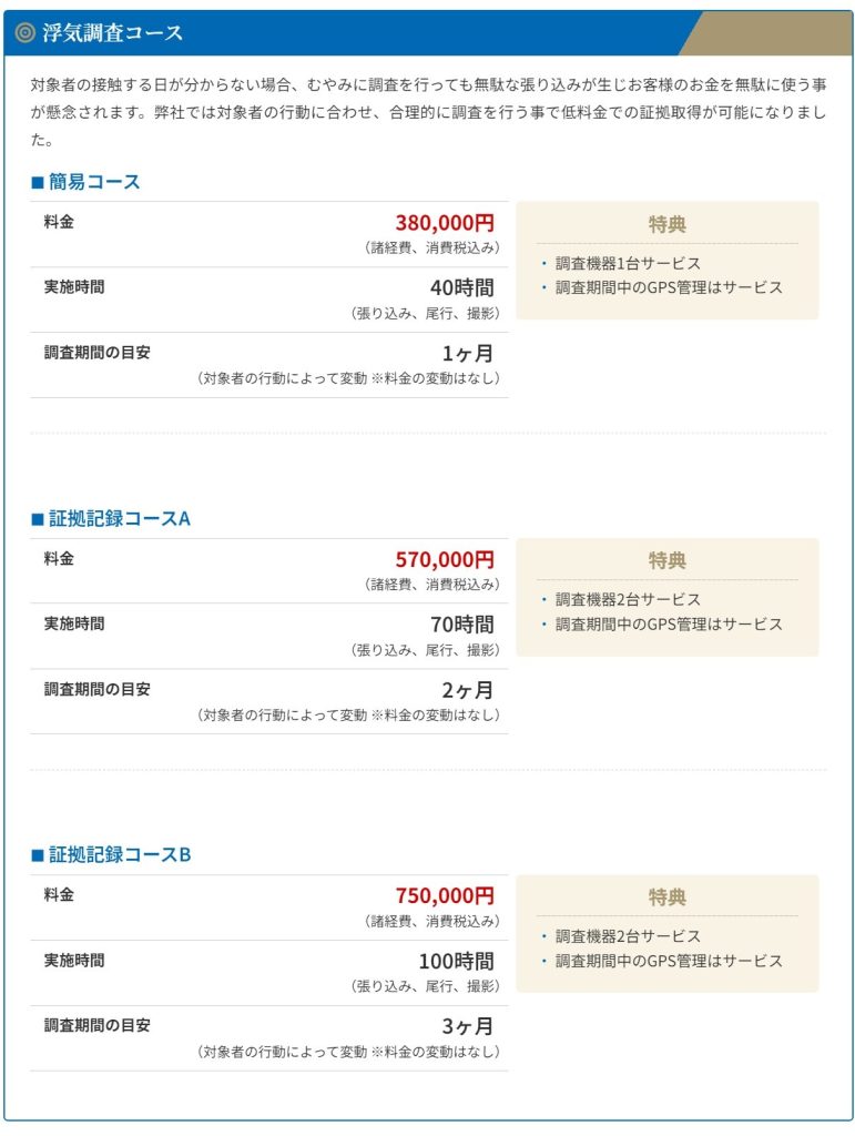 ■証拠記録コースA 570,000円(諸経費、消費税込み)実施時間70時間(張り込み、尾行、撮影)調査期間の目安2ヶ月(対象者の行動によって変動※料金の変動はなし)