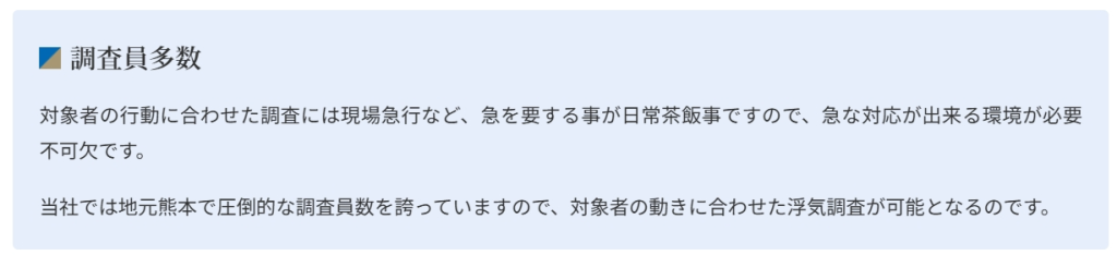 対象者の行動に合わせた調査には現場急行など、急を要する事が日常茶飯事ですので、急な対応が出来る環境が必要不可欠です。当社では地元熊本で圧倒的な調査員数を誇っていますので、対象者の動きに合わせた浮気調査が可能となるのです。